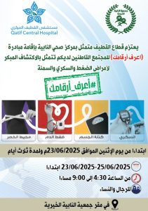 تحت شعار (اعرف أرقامك للمجتمع القاطنين لديكم) لمدة ثلاثة أيام التاريخ: يونيو 22, 2025 11 مشاهدة يعتزم قطاع القطيف متمثل بمركز صحي النابية بإقامة مبادرة ( اعرف أرقامك للمجتمع القاطنين لديكم ) تتمثل بالاكتشاف المبكر لأمراض الضغط والسكري والسمنة.