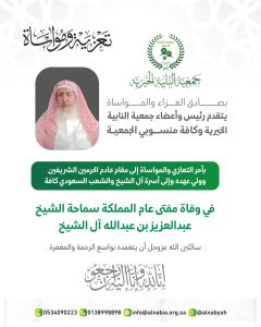 تتقدّم جمعية النابية الخيرية بخالص التعازي وصادق المواساة إلى مقام خادم الحرمين الشريفين، وولي عهده الأمين، والشعب السعودي كافة، والأمة الإسلامية في وفاة سماحة مفتي عام المملكة الشيخ #عبدالعزيز_بن_عبدالله_آل_الشيخ –رحمه الله رحمة واسعة وأسكنه فسيح جناته